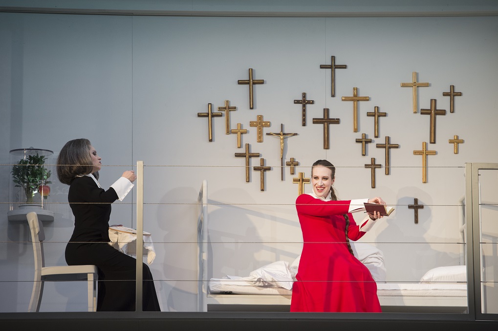 In Müller’s stage direction, Rigoletto is not a spotted-hunchbacked court jester here, but a respected state councilor, massive, black, almost clad clerical.  Instead of an underdog, more the duke’s mate, with whom he shares a passion: domination over women. For the macho it can be any of them, the counterpart's erotic obsession is religiously delusional split: in the Madonna of paper, which he carries with him like a monstrance, which he nearly assimilates in a cannibalistic manner, and in Gilda as a red sacro-doll, which he keeps in a glass-cage-prison, decorated with red crosses. Church Gothic suggests black-romantic horror, and red daughter-doubles are prisoned in cages in the Münsteran Anabaptist style.